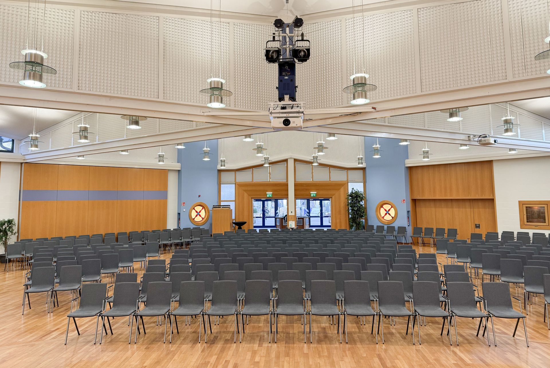 Der große Saal mit einer Fläche von 590 m² kann bei Bedarf in zwei oder vier Räume geteilt werden. Die Trennwände sind blickdicht und schallgedämmt.In alle Räume gelangt (trotz Unterteilung), durch ein architektonisch ausgeklügeltes System, Tageslicht.